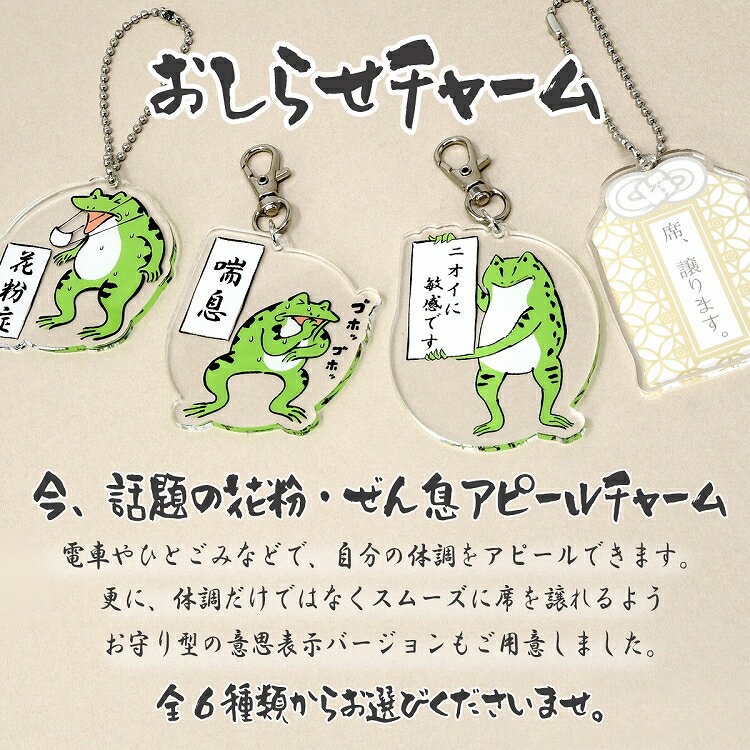 素材 アクリル サイズ A:(約)5.5×5.5cm B:(約)5.5×5.5cm C:(約)5.5×7.0cm D:(約)5.5×7.0cm E:(約)5.5×7.0cm F:(約)4.5×7.0cm ボールチェーン:(約)7cm 全長(約)16cm ナスカン:(約)4.7cm 仕様 選べる留め具付き デザイン デザインA(花粉症) デザインB(喘息) デザインC(花粉症) デザインD(喘息) デザインE(ニオイに敏感です/文字) デザインF(席、譲ります) ※詳しくは商品ページ画像をご確認くださいませ。